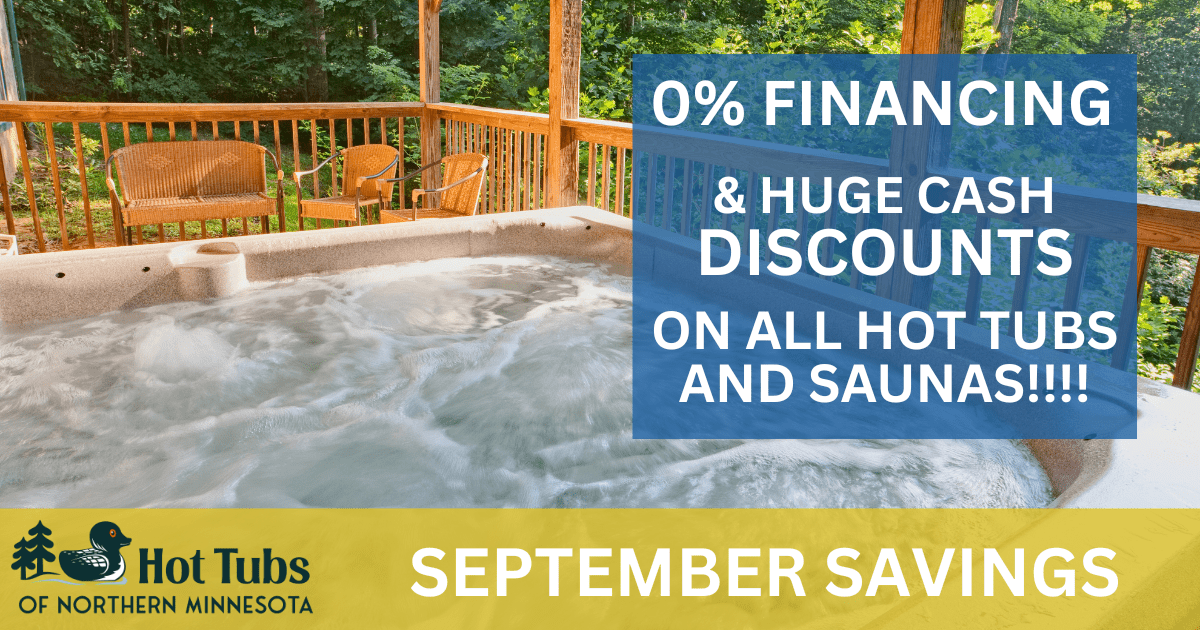 September Savings 0% Financing and huge cash discounts on all hot tubs and saunas!